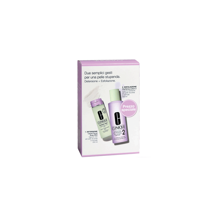 Il set contiene: -Liquid Facial Soap Mild 200ml: sapone viso che non inaridisce la pelle e minimizza le desquamazioni superficiali, lasciando la pelle pulita, confortevole, rinfrescata, mai tesa o arida. - Clarifying Lotion 2 400ml: libera con delicatezza la superficie cutanea da ogni forma di desquamazione e rivela una pelle più fresca e vitale.